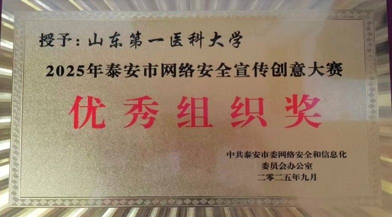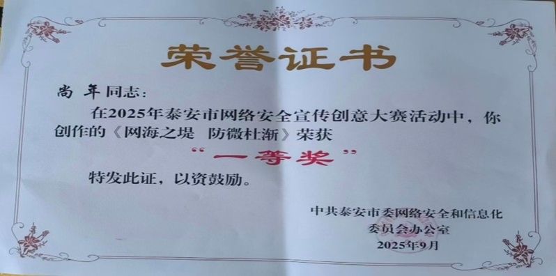 2025年9月28日,由泰安市网信办主办的泰安市网络安全宣传创意大赛举行颁奖仪式。本次大赛经前期选拔推荐,共有450件作品参赛。其中,校(院)现代教育技术中心(网络信息中心)尚年老师的作品《网海之堤 防微杜渐》荣获一等奖,校(院)同时获评优秀组织奖。